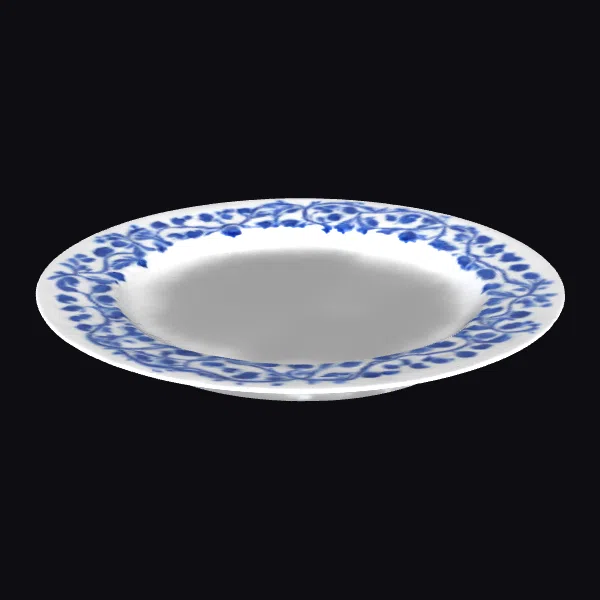 Positioned centrally, the plate boasts a classic, symmetrical design with a wide, shallow bowl that tapers slightly towards the rim. The blue floral pattern, reminiscent of traditional porcelain, meticulously wraps around the plate’s edge, featuring intertwining vines and stylized flowers. The white glaze provides a smooth, glossy finish, while the floral motifs are rendered in a softer, more muted blue, creating a beautiful contrast. The plate’s proportions are harmonious, with a sturdy base that ensures stability. Ideal for use in games, 3D printing, virtual reality, animation, and design projects, this model brings a piece of timeless elegance to any creative endeavor.