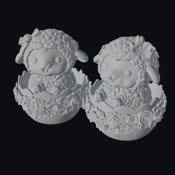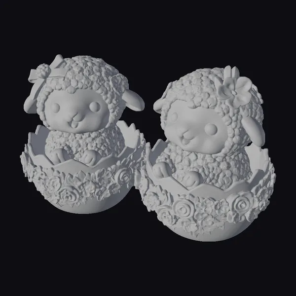 Rendered in a delightful, stylized manner, these lambs are captured in a sitting position within their decorated eggs, which boast intricate floral patterns and gold accents. Their fluffy white coats, rosy cheeks, and endearing facial expressions make them perfect for Easter-themed projects or as cute additions to any scene. The lamb on the left sports a blue bow with a white pom-pom, adding an extra layer of charm. These models are ideal for use in animations, games, 3D printing, virtual reality experiences, and design projects where a touch of Easter magic is desired.
