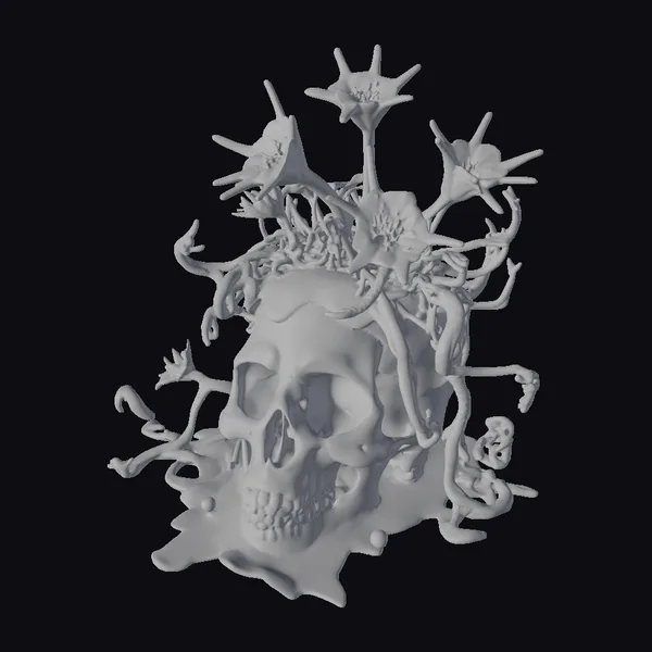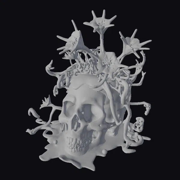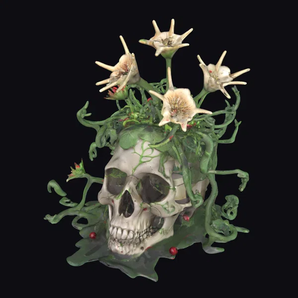 This striking model showcases a human skull enveloped by organic, curly vines and topped with large, white flowers that resemble a mix of flora and sharp, defensive mechanisms. The skull itself is detailed with realistic textures, while the vines and flowers appear to be growing directly from it, creating a seamless blend of life and death. The model’s base is covered in more vines and red berries, adding depth and a splash of color. The quality of the model is evident in its detailed textures and the intricate design of the floral arrangement. Ideal for use in games, 3D printing, VR/AR experiences, animation, and design projects where a touch of the macabre is desired.