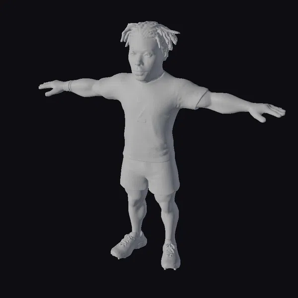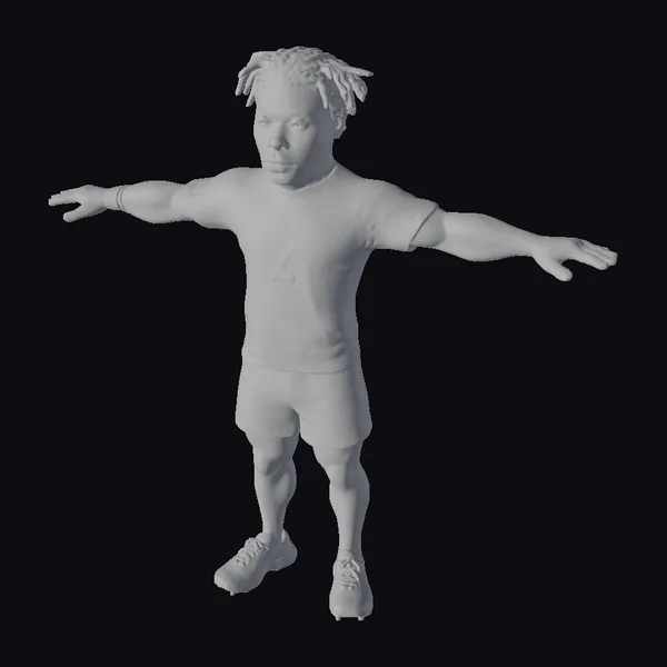Standing confidently with arms outstretched, this 3D model of a male soccer player exudes a sense of readiness and focus. His dark hair is styled in short dreadlocks, complementing his tan skin tone. The athlete’s red jersey features a prominent white number 7 on the chest, while green shorts and tan cleats complete his sporty look. Red, white, and black armbands add a dynamic touch to his arms. This model is perfect for projects requiring a sports-themed character, such as animations, games, or simulations. Its stylized yet realistic appearance ensures it will stand out in any visual narrative.