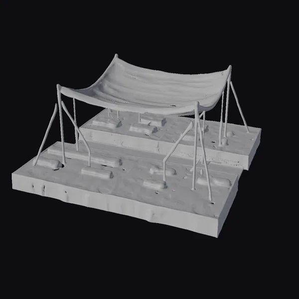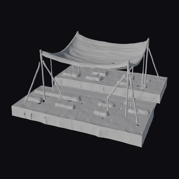 In a detailed and realistic representation, the fog net farming system is captured in a 3D model that showcases its functional design. The metal frame, with its multiple support poles, holds the netting high above the wooden platform, which features several rectangular blocks likely representing planters or soil beds. The netting itself appears durable, with a slightly weathered look that suggests extensive use. This model is perfect for projects focused on sustainable farming practices, agricultural technology, or industrial agriculture. Its realistic textures and lighting make it suitable for high-quality visuals, such as animations, games, or architectural visualizations.