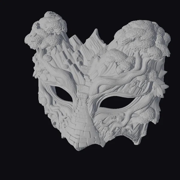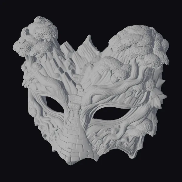Crafted with meticulous detail, this fantastical mask showcases a winding stone staircase that appears to lead into the very soul of the forest. The staircase is enveloped by gnarled tree roots and vibrant green foliage, creating a sense of mystique and wonder. The mask’s surface is richly textured, with the rough, organic feel of tree bark and moss contrasting with the smooth, weathered stone. The eye openings are shaped like natural archways, inviting the wearer to peer out into the world. This mask would be a stunning addition to any 3D model collection, suitable for use in games, animation, VR/AR experiences, and print projects.