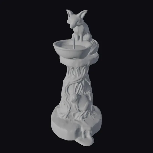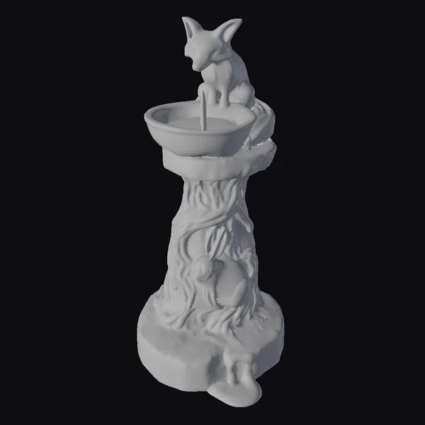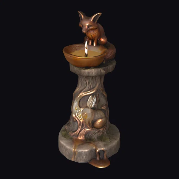 Detailed with precision, the fountain showcases a fox with intricate fur texture, sitting calmly on a bronze bowl from which a small stream of water flows. The base of the fountain is designed to resemble a tree trunk, complete with a rabbit peeking out, adding a playful touch. The combination of bronze and stone materials gives the fountain a luxurious feel. Ideal for games, animation, or architectural visualizations, this model brings a touch of serenity and fantasy to any scene. Its realistic style and detailed textures make it perfect for close-up shots or as a background element.