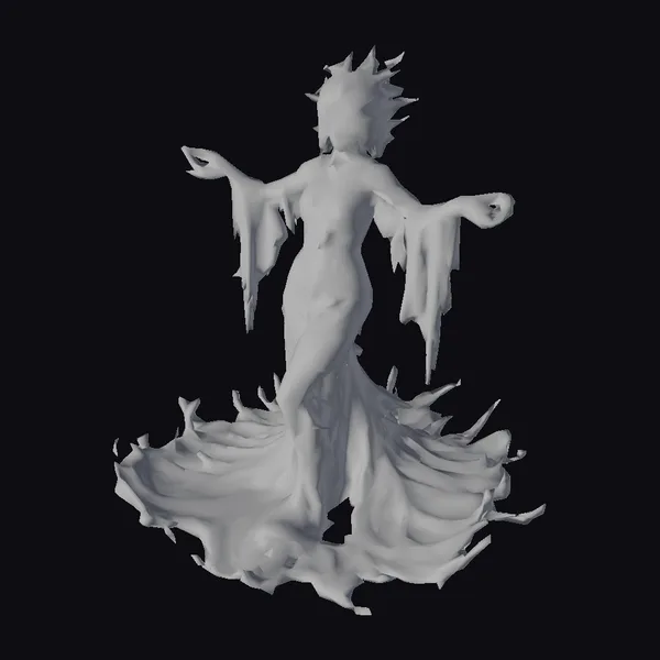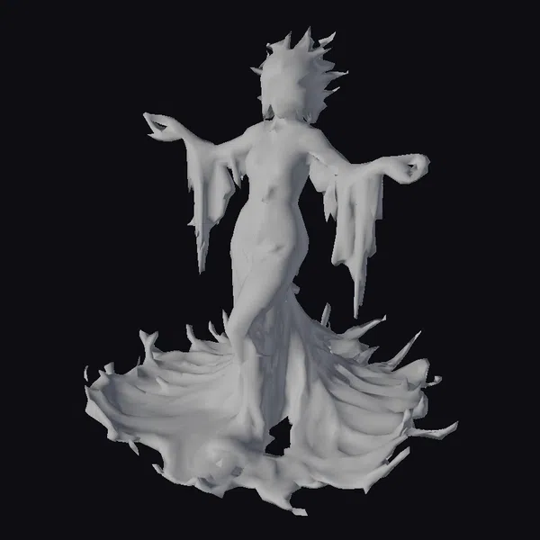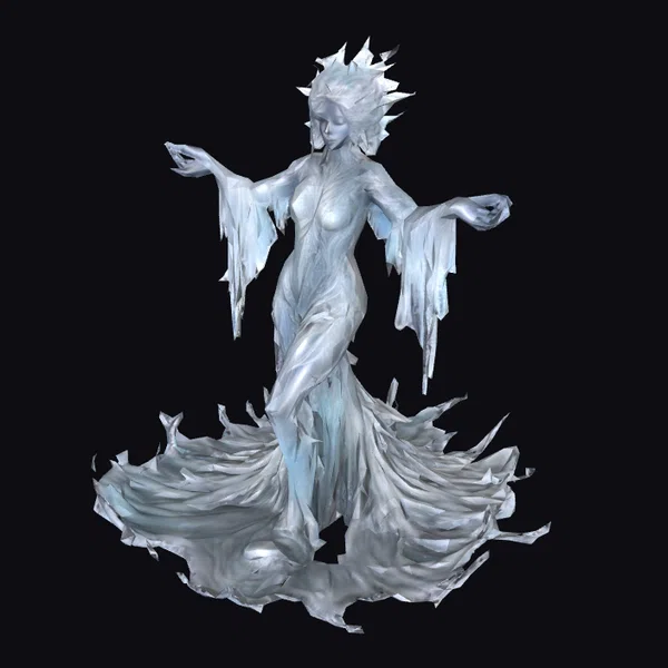 Gazing upon this frosty female spirit, you’re immediately struck by the intricate details of her icy form. Her body and dress appear to be crafted from shimmering ice, with a subtle gradient of blues and whites that evoke the shifting colors of the aurora borealis. Her pose is dynamic, with arms outstretched and dress flowing around her like a misty aura. The facial features are delicately rendered, with a serene expression that suggests a deep connection to the natural world. This model would be perfect for use in games, animations, or 3D prints where a touch of fantasy and magic is needed. Its ethereal beauty and tranquil mood make it an excellent choice for projects that require a sense of wonder and enchantment.