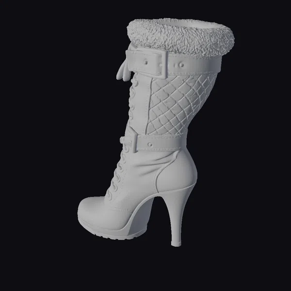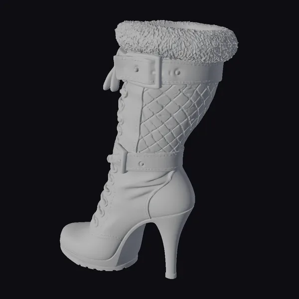 Positioned in a dynamic stance, the boot showcases its intricate details: a quilted leather upper, a fur-lined cuff for added warmth and texture, and a lace-up front complemented by a secure buckle strap. The high heel and pointed toe lend an air of elegance, making it a versatile piece for various design applications. Ideal for use in fashion design, animation, or as a 3D asset in virtual environments, this model captures the essence of high-end footwear with precision.