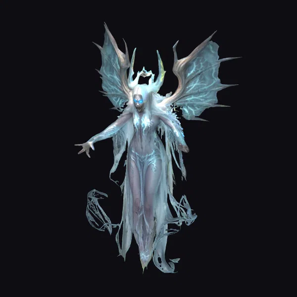 This banshee creature is captured in a state of furious suspension, her body floating dynamically in the air. Her pose is one of raw power, with arms outstretched and wings spread wide, showcasing a blend of terrifying and mesmerizing features. The creature’s face is a masterpiece of detail, with glowing blue veins that pulse with an otherworldly energy. A long, flowing cloak surrounds her, partially transparent and billowing as if caught in a wind. Her very long hair cascades down, adding to the dramatic effect. The large, bat-like wings are spread wide, their texture and structure meticulously detailed. This model is perfect for use in games, 3D printing, VR/AR experiences, animation, and design projects where a touch of fantasy and horror is needed.