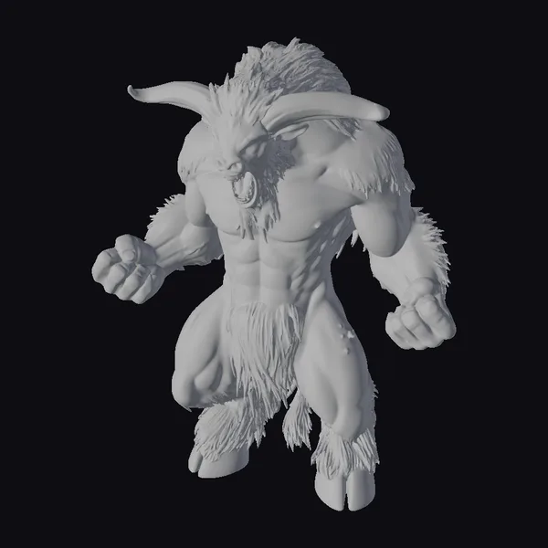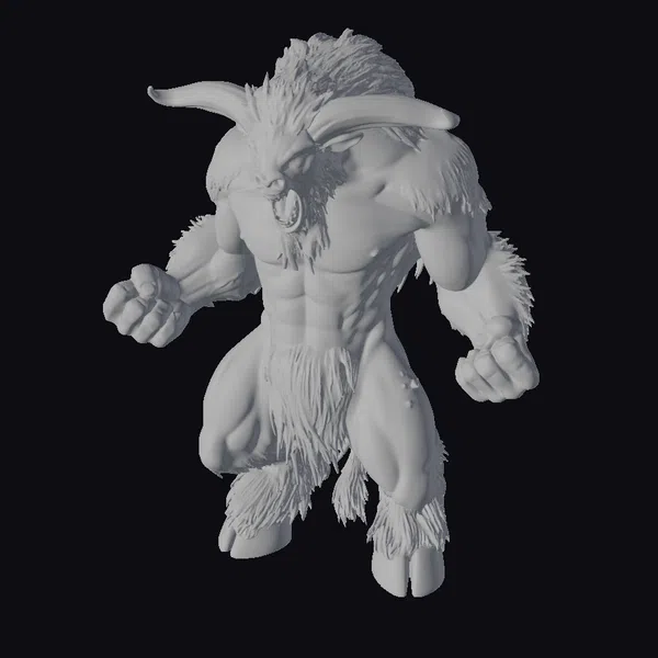 Standing tall with a powerful build, this mythical creature boasts a thick layer of brown fur covering its muscular physique, complemented by sharp black horns that curve menacingly from its forehead. Its aggressive stance, with fists clenched and legs positioned for a charge, captures a moment of raw energy and strength. The creature’s sharp claws and detailed facial features, including a fierce expression and prominent teeth, add to its intimidating appearance. This 3D model is perfect for use in fantasy games, animations, or as a detailed addition to virtual reality experiences, offering a high level of detail that can be used to create immersive environments or characters.