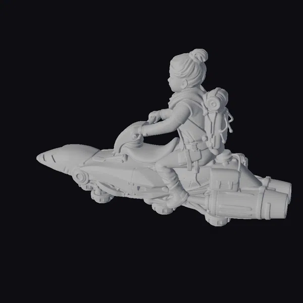 In a dynamic pose, the young woman sits confidently on her futuristic motorcycle, her brown hair neatly tied up in a bun. She wears a practical outfit consisting of a tan jumpsuit and a utility backpack, suggesting she’s ready for a long journey. The motorcycle itself is a marvel of design, with a sleek tan and black body, complete with a pointed front and a large storage compartment at the back. The model’s attention to detail, from the rider’s determined expression to the intricate design of the motorcycle, makes it perfect for use in games, 3D printing, VR/AR experiences, animation, and design projects.