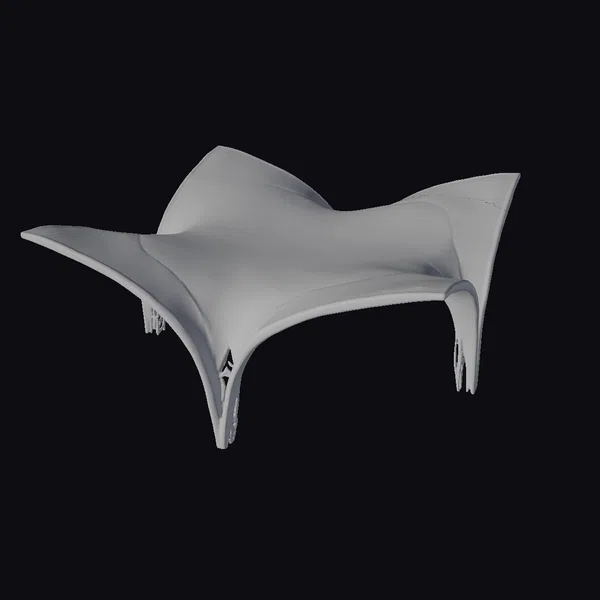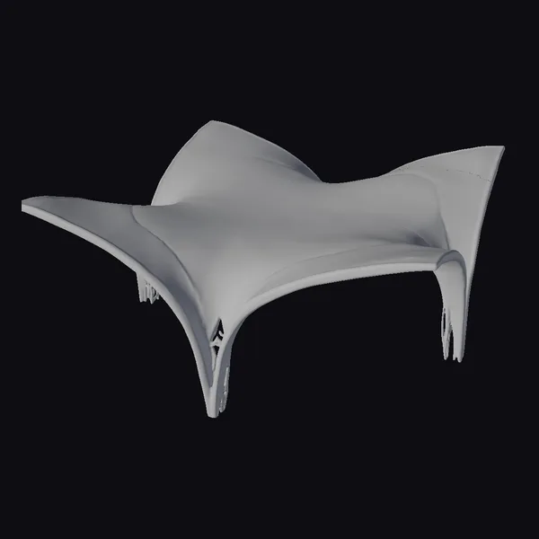 Perched on four metallic supports, this futuristic arched structure boasts a smooth, gray surface with a subtle texture that hints at its metallic composition. The curved design is both fluid and geometric, suggesting a blend of organic and synthetic elements. As the structure angles upwards, its four pointed extensions create a sense of movement and energy. This model is perfect for adding a touch of sci-fi flair to games, animations, or architectural visualizations. Its unique design and sleek aesthetic make it an excellent choice for designers and artists looking to push the boundaries of their creativity.