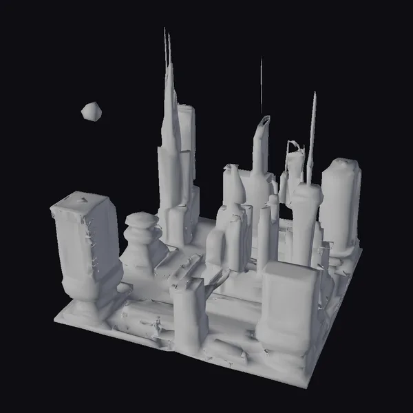 Gaze upon a sprawling metropolis of the future, where sleek skyscrapers pierce the sky and neon lights dance across the dark, metallic surfaces. This intricately detailed diorama presents a cityscape that is both haunting and mesmerizing, with a mysterious floating rock adding an air of enigma.