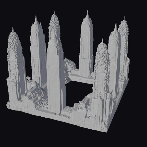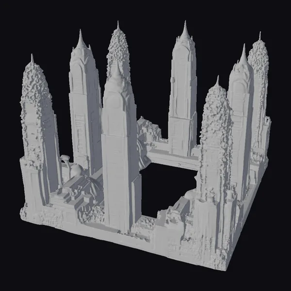 Perched on the precipice of a bygone era, this futuristic cityscape presents a breathtaking tableau of elegance and neglect. Eight imposing skyscrapers, their facades weathered to a soft gray, rise like giants from the earth. Moss and greenery have begun to reclaim the structures, as if nature itself is attempting to erase the memories of a long-lost civilization. The central archway, once a bustling thoroughfare, now stands as a haunting void. As light dances across the intricate textures, the city’s worn beauty is revealed. Ideal for use in games, 3D printing, VR/AR experiences, animation, and architectural design projects.