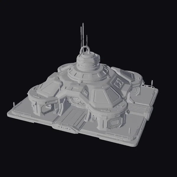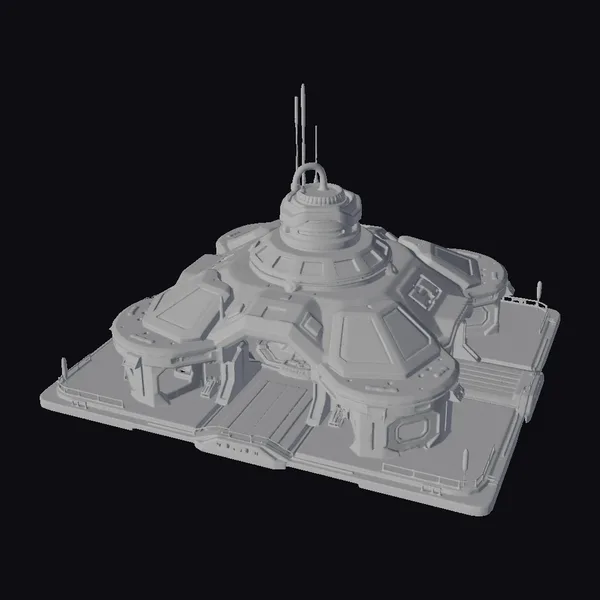 Positioned dynamically on a vast, metallic platform, the habitat module showcases a complex, geometric design with multiple levels and protruding elements. The exterior is a blend of smooth surfaces and detailed textures, featuring subtle tubing, vents, and generators that highlight its life-support capabilities. A central dome structure, complete with antennae, crowns the module, suggesting advanced communication and surveillance systems. The habitat’s design emphasizes functionality and durability, with a predominantly silver and gray color scheme that underscores its industrial and high-tech nature. Ideal for use in sci-fi games, virtual reality experiences, architectural visualizations, and animations, this model brings a touch of futuristic realism to any project.
