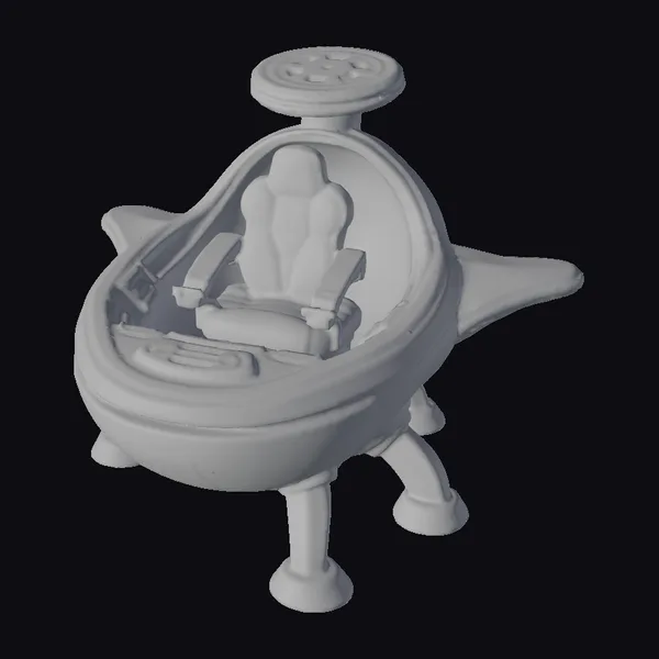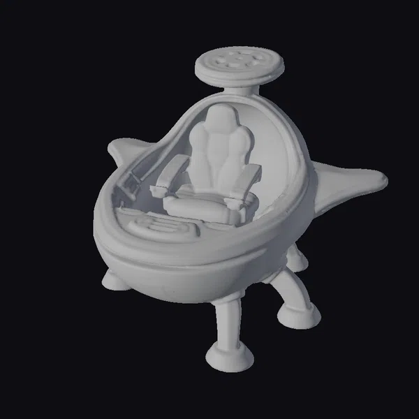 Perched atop slender legs, the Command Pod exudes an air of high-tech sophistication. The pod’s interior is a marvel of design, with a cushioned seat positioned centrally, flanked by an array of futuristic controls and illuminated panels. A glowing blue ring encircles the pod, casting an ethereal light on the dark metallic surfaces. The pod’s unique shape, complete with a raised control panel on top, suggests a design focused on functionality and ease of use. This 3D model would be perfect for use in games, animations, or architectural visualizations where a futuristic feel is desired.