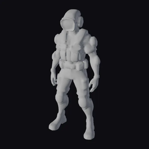 Standing tall with its weight evenly distributed on both feet, this robotic explorer is detailed with a mix of gray metallic parts and tan tactical gear. The white and black helmet, complete with a blue-tinted visor, adds to its otherworldly appearance. The outfit includes a tactical vest, cargo pants, and knee-high boots, suggesting readiness for any mission. The model showcases intricate details such as the mechanical limbs, utility belt, and pouches, indicating a high level of realism and suitability for projects requiring a futuristic character. Ideal for use in video games, animations, or virtual reality experiences, this model brings a sci-fi aesthetic to any project.