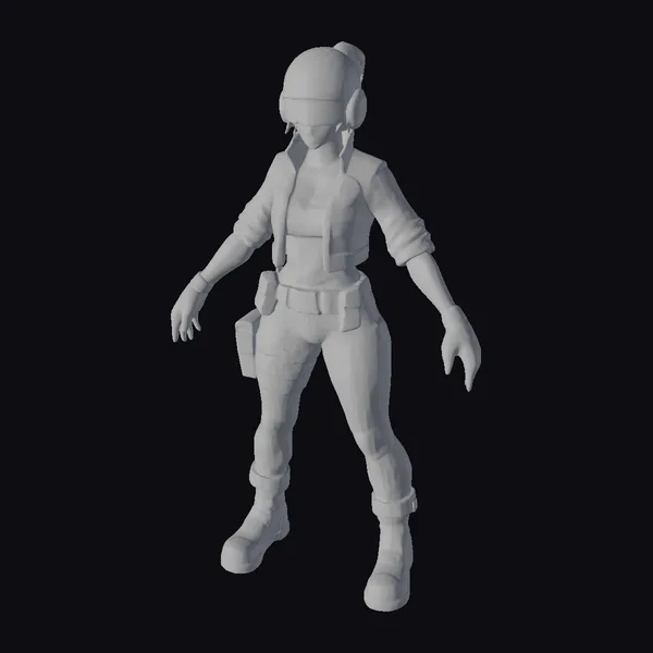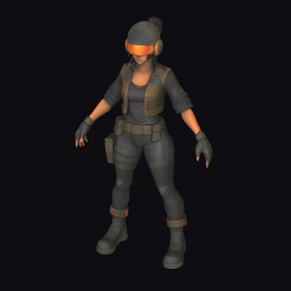 Standing poised and alert, this futuristic sentinel model showcases intricate details such as a utility belt, tactical gloves, and a practical yet stylish outfit designed for both mobility and protection. The orange-tinted goggles not only serve as a striking visual element but also add to her vigilant demeanor. Her hair is styled in a practical yet stylish updo, tucked away under her helmet. This model is perfect for projects requiring a blend of futuristic technology and tactical readiness, suitable for games, animations, VR/AR experiences, and architectural designs that envision a futuristic world.