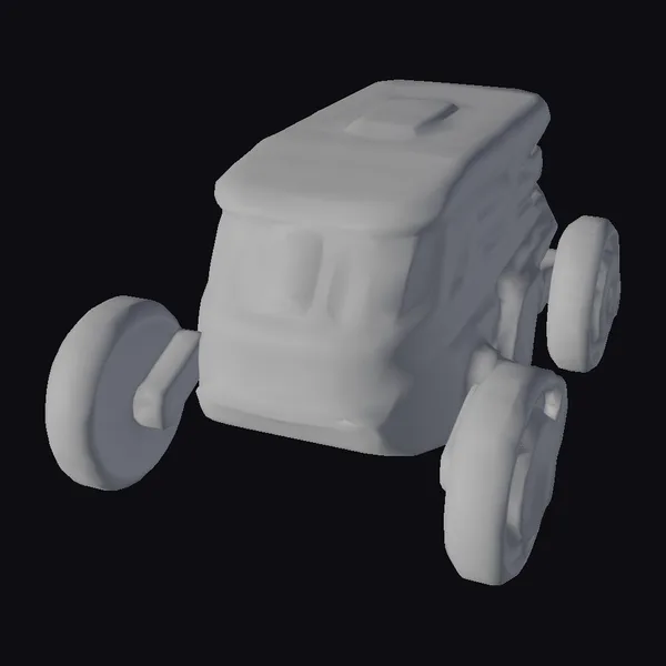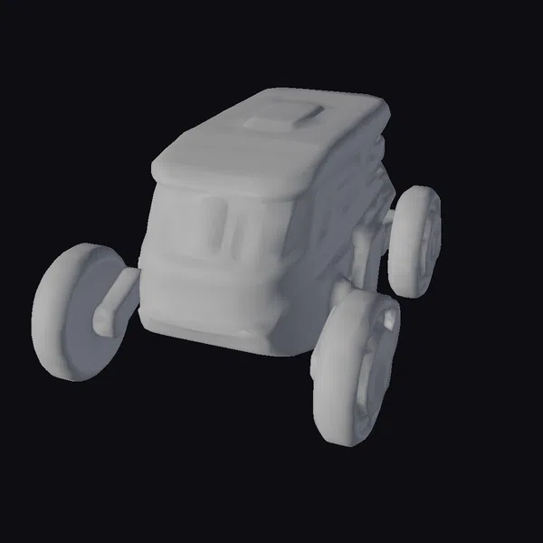 Positioned dynamically, the vehicle showcases its detailed design, from the textured metallic surface to the illuminated green buttons on the front. The oversized wheels with white outlines give it a sturdy stance, while the orange headlights and green glowing accents add a pop of color. This model is perfect for projects requiring a futuristic touch, such as animations, games, or sci-fi themed designs. Its cartoonish yet detailed style makes it versatile for various creative applications.