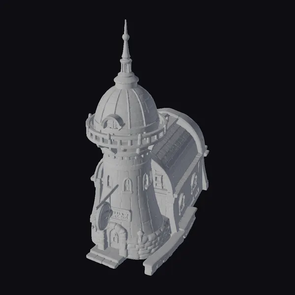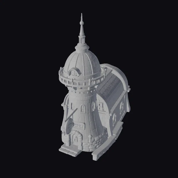 In a majestic pose, the futuristic harbor tower showcases its unique blend of materials and architectural styles. The lower section, constructed from rough-hewn stone, provides a sturdy base for the wooden upper levels, which feature a distinctive orange-brown hue. A prominent copper dome, adorned with a gold steeple, draws the eye upward, while a wraparound balcony and ornate details add visual interest. The tower’s windows, a mix of small panes and larger, arched openings, allow for a glimpse into the interior. This 3D model is perfect for use in games, animation, or architectural design, offering a richly detailed and imaginative structure that can transport viewers to fantastical worlds.