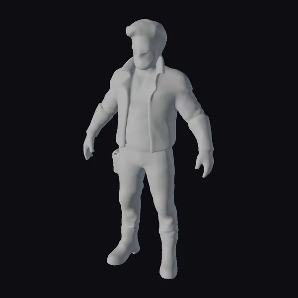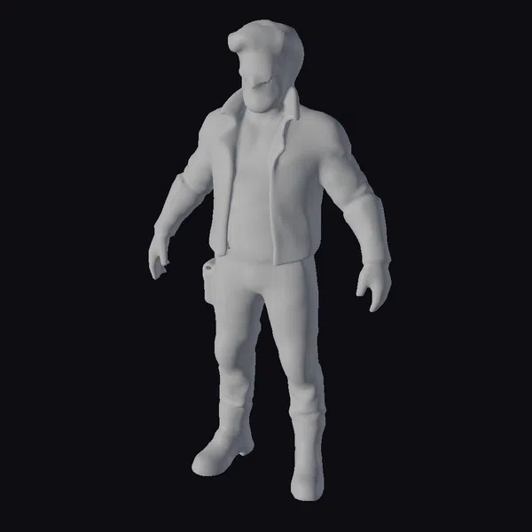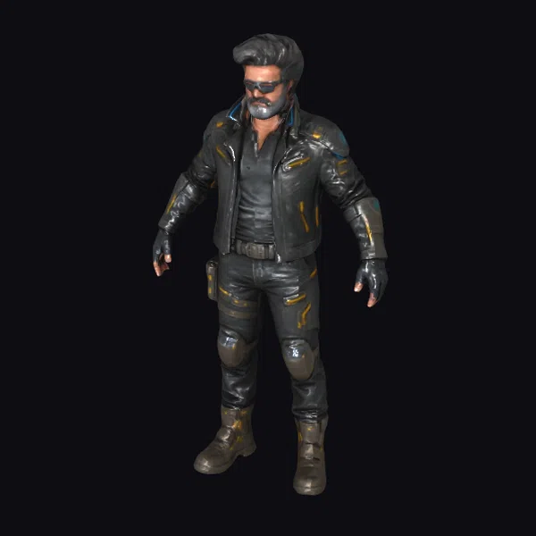 Detailed with precision, this futuristic hero boasts a strong physique clad in a black leather jacket and pants, adorned with striking gold accents that suggest advanced technology. His dark hair is styled to perfection, complementing his graying beard and mustache. The hero’s attire is completed with fingerless gloves and sturdy boots, exuding a sense of readiness for action. His sunglasses hint at a mysterious persona. This model is meticulously crafted with high-quality textures and realistic proportions, making it ideal for use in games, 3D printing, VR/AR experiences, animation, and design projects.