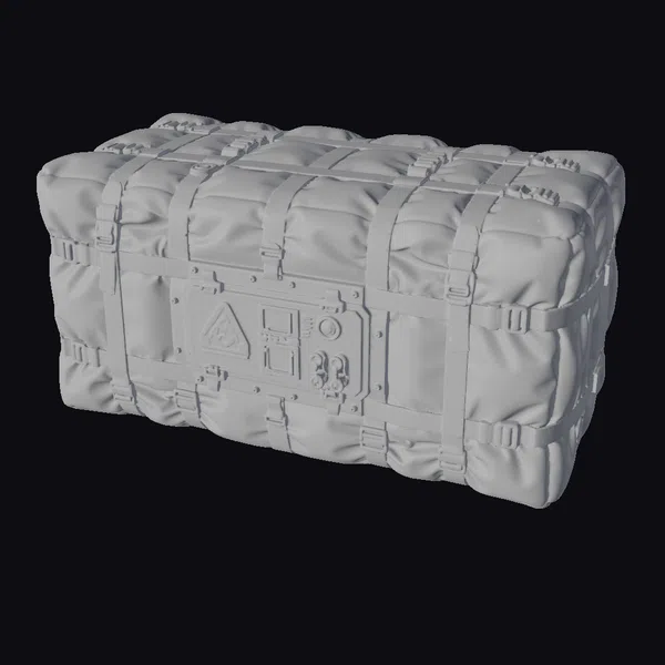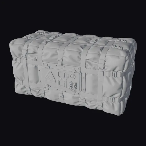 This detailed 3D model of a futuristic cargo package showcases a rectangular shape wrapped in thick, soft, insulated padding. The outer material looks durable and resistant, with bright red straps secured by metal buckles, adding a pop of color and suggesting a high level of security. A control panel on the front features a yellow danger sign, two small screens, and various buttons and dials, implying advanced technology. The package’s design suggests it’s meant for transporting sensitive or hazardous materials. Its detailed appearance makes it suitable for use in games, animations, or as a design reference.