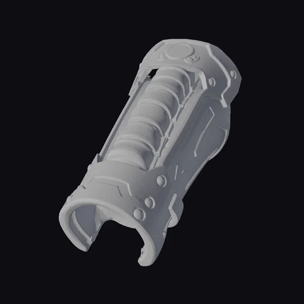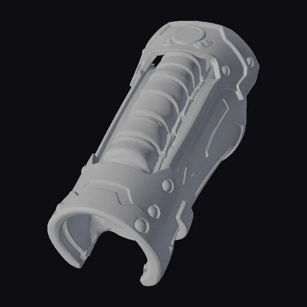 Positioned dynamically with its cuff open and ready, this futuristic metal gauntlet showcases a blend of form and function. The detailed metallic surface reflects light, highlighting its rugged texture and the series of connected, rounded segments that offer flexibility and protection. A button or control interface is prominently featured at the top, suggesting advanced functionality. The gauntlet’s design would complement a variety of sci-fi settings, from cyberpunk cityscapes to epic space adventures, making it a versatile asset for 3D artists and designers working on projects that demand a touch of futuristic flair. Whether it’s for a video game character, a virtual reality experience, or an animated film, this gauntlet adds a layer of authenticity and detail.