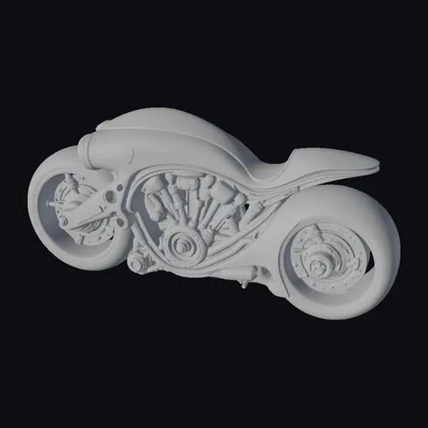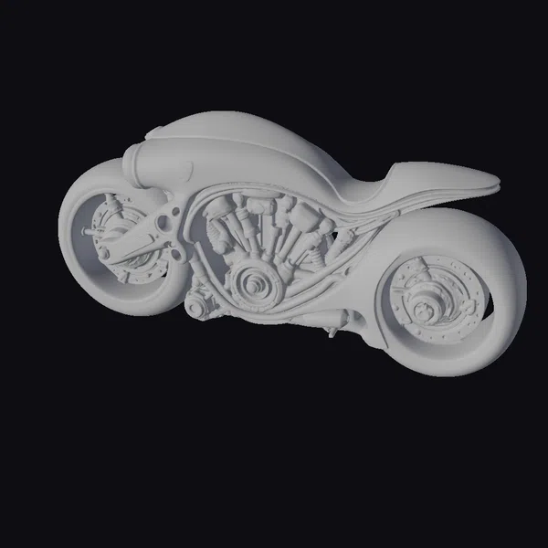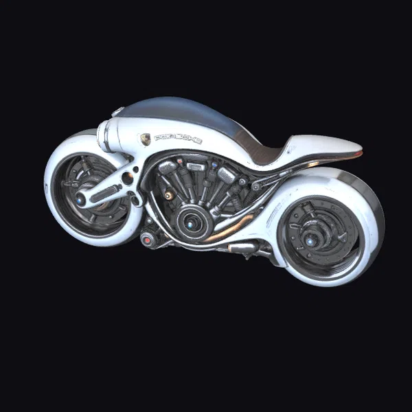 Positioned dynamically, this futuristic motorcycle showcases a blend of sleek design and advanced technology. The model features a predominantly silver and black color scheme, with intricate details on the engine and wheels. The futuristic design elements, such as the streamlined body and advanced engine components, make it an ideal asset for projects requiring a cutting-edge aesthetic. Suitable for use in games, 3D print projects, VR/AR experiences, animations, and design visualizations.