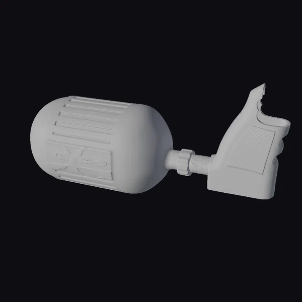Positioned dynamically, the blaster’s grip and barrel form a sharp, angular silhouette, as if poised for action. The surface is etched with fine lines and panels, suggesting a complex assembly of advanced components. A series of raised sections near the grip provide a textured surface, implying a secure hold even in high-stress situations. The barrel’s end is flared, hinting at a powerful energy output. This model is perfect for game developers, animators, and designers seeking to infuse their projects with a touch of futuristic flair. Whether for a sci-fi game, animation, or VR experience, this blaster model is designed to impress with its detailed craftsmanship and menacing presence.