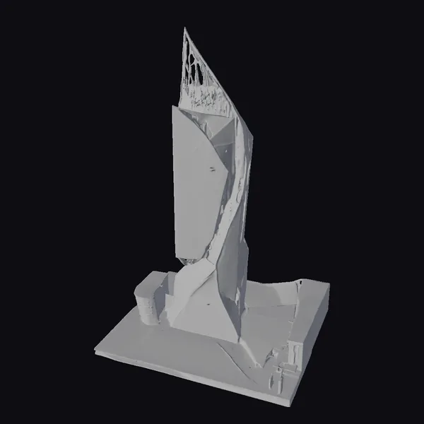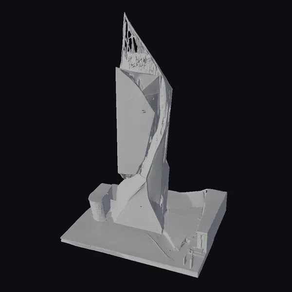 Perched on a flat, square base, the skyscraper rises with a series of interconnected, faceted surfaces that reflect light like polished metal. The tower’s design is characterized by sharp angles and a sense of dynamic movement, as if it’s about to propel itself into the sky. Smaller structures dot the base, suggesting a thriving metropolis. The model’s intricate details and realistic textures make it perfect for use in games, 3D printing, VR/AR experiences, animation, and architectural design.
