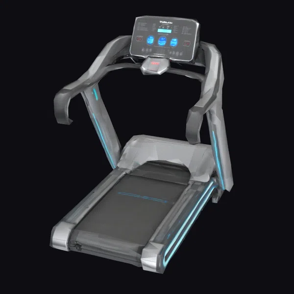 Positioned at an inviting angle, the treadmill’s futuristic design is showcased in exquisite detail. The dark gray and metallic frame is accentuated by vibrant blue lights tracing along its sides and a digital console at the top, complete with glowing blue buttons and a small display screen. The running surface is a darker gray, bordered by lighter metallic edges. This model is ideal for use in games, architectural visualizations, print projects, VR/AR experiences, and animations where a high-tech aesthetic is desired.