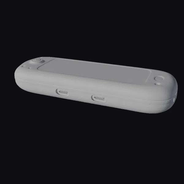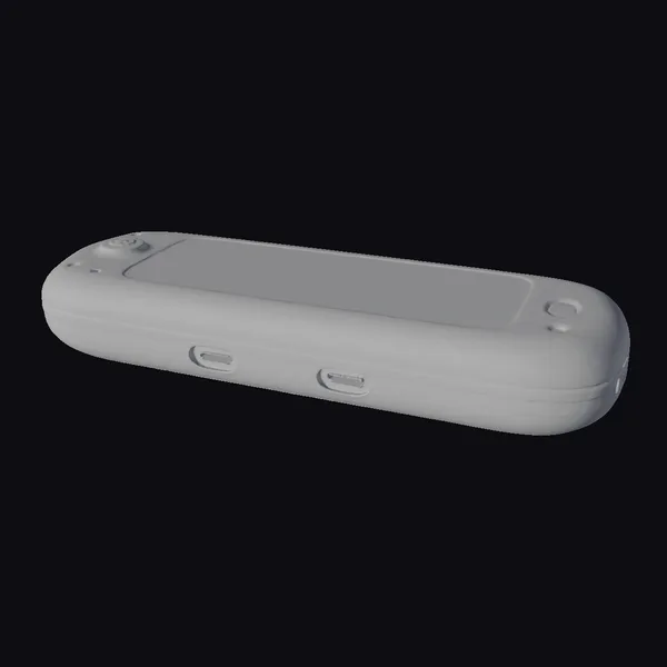 Positioned at a dynamic angle, the device showcases its smooth, gray surface and prominent black screen. Two USB ports and what appears to be a charging port are neatly integrated into its side. The rounded edges and compact design suggest portability and user-friendliness. The device’s futuristic design makes it an excellent addition to any sci-fi scene or a prop for projects focusing on advanced technology. Its detailed design and sleek appearance make it suitable for high-quality 3D modeling projects, animations, or video game environments where cutting-edge gadgets are a focus.