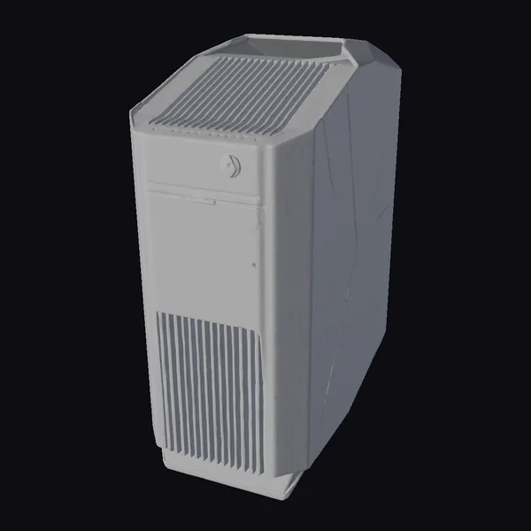 Detailed with precision, this gaming computer tower model showcases a robust design with a slanted top and a prominent vented area, complemented by a glowing blue circle emblem. The side panels feature angular, glowing blue lines that add a dynamic touch. The tower’s proportions are meticulously captured, from the closely spaced vertical vents on the front to the expansive vented area on top. The model is well-suited for projects requiring a modern, high-tech aesthetic, such as game development, architectural visualizations, or product design. Its detailed textures and accurate proportions make it an excellent choice for animation, VR/AR experiences, and 3D printing.