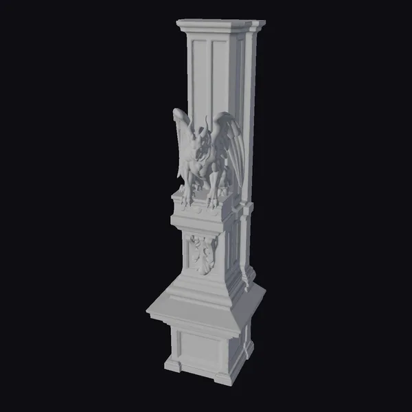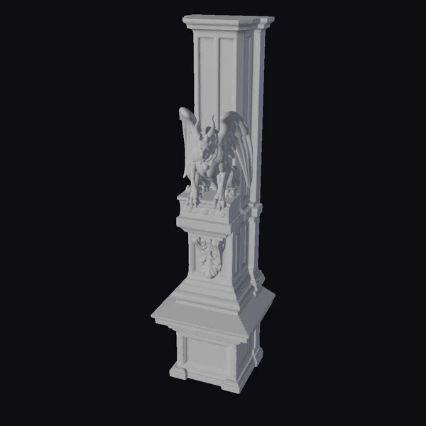 This detailed architectural ornament features a gargoyle perched on a square column with a pyramidal roof, showcasing exceptional craftsmanship. The gargoyle’s pose, with wings outstretched and claws gripping the stone, captures a moment of dynamic tension. The column itself is adorned with ornate carvings and exhibits signs of aging, including discoloration and texture that suggests the passage of time. The model is highly detailed, making it suitable for close-up shots or as part of a larger architectural scene. Ideal for use in games, 3D printing, VR/AR experiences, animation, and design projects where historical or mystical elements are desired.