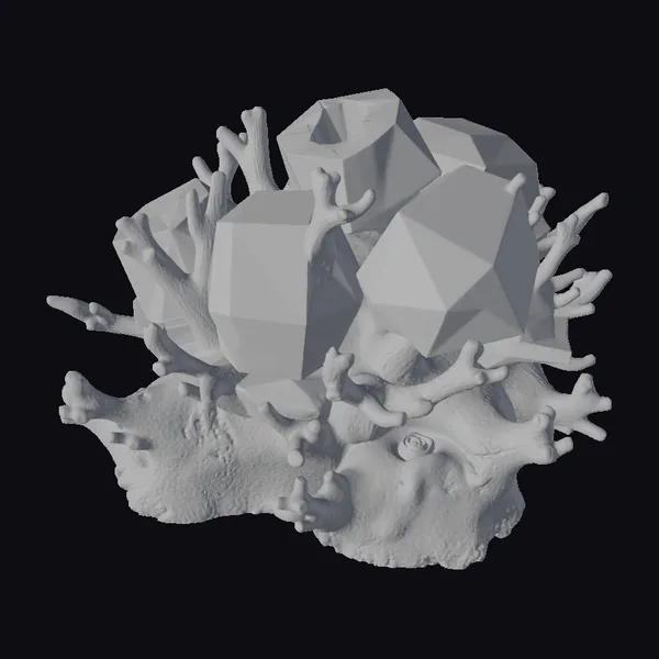 Perched atop a rugged, purple-hued base, a cluster of gleaming blue and purple polyhedrons takes center stage, their facets reflecting a kaleidoscope of colors. The coral itself appears to be infused with a vibrant, neon-lit essence, as if the very fabric of reality has been rewoven with a mesmerizing glow. Delicate, branching tendrils of coral stretch upwards, as if attempting to grasp the geometric formations. This extraordinary scene is perfect for adding a touch of sci-fi wonder to games, animations, or virtual reality experiences. The model’s intricate details and realistic textures make it an ideal choice for designers seeking to craft immersive, futuristic environments.