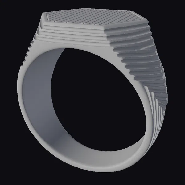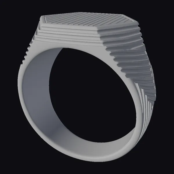 Positioned at a slight angle, the geometric silver ring showcases its unique design with a flat, wide band that tapers slightly towards the bottom. The top surface features a series of parallel lines that run across its length, while the sides are adorned with a pattern of intersecting lines, creating a sense of depth and visual interest. The ring’s metallic surface reflects light, accentuating its modern aesthetic. Ideal for use in games, 3D printing, VR/AR experiences, animation, and design projects, this model offers a high level of detail and realism. The ring’s geometric pattern and shiny finish make it a versatile asset for various applications.