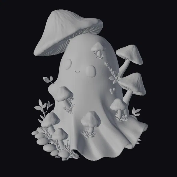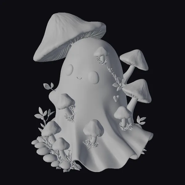 Floating dynamically against a crisp white background, this cartoon ghost is meticulously detailed with a large, curved mushroom cap on its head, complete with white spots and a soft, purple glow. The ghost’s body is adorned with smaller mushrooms and delicate flowers, enhancing its ethereal appearance. Its pose is relaxed, with a subtle smile and large, black eyes that sparkle with friendliness. The ghost’s translucent body shimmers with a soft, pastel purple hue, complemented by the vibrant colors of the mushrooms. This model is perfect for use in games, animations, or 3D printing, offering a unique and captivating character design that will add a touch of magic to any project.