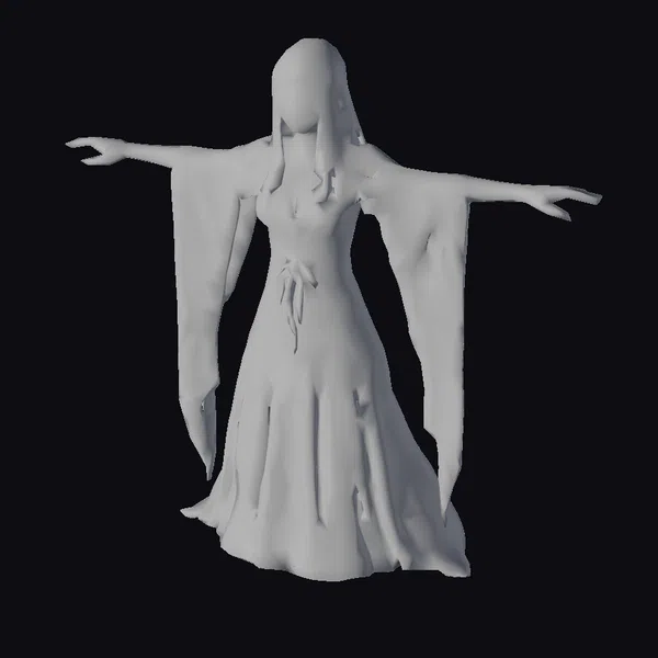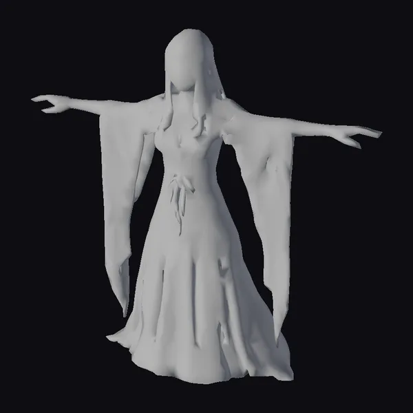 Rendered in exquisite detail, this ghostly female spirit stands poised in a perfect T-pose, her arms outstretched to the sides. Her translucent, tattered form appears to flicker between visibility and shadow, as if caught in a state of ethereal limbo. The dress, tattered and worn, flows around her like a dark mist, while her face is a hollow, skull-like visage with glowing eyes that seem to pierce through the darkness. The overall effect is one of haunting beauty, as if this spectral being has stepped straight from the realms of the unknown. Ideal for use in games, animation, VR/AR experiences, or 3D printing, this model is sure to add a touch of the paranormal to any project.