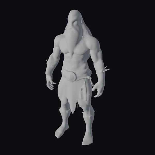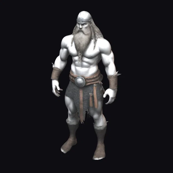 Detailed with precision, this giant stands with a powerful stance, his muscles bulging beneath his pale skin. His long, dark hair cascades down his back, merging with his equally impressive beard. The runes tattoos add an air of mystique, while his glowing eyes suggest an otherworldly power. The contrast between his rugged, battle-ready appearance and the elegance of his glowing eyes creates a compelling character. This model is perfect for projects requiring a mythical or fantasy element, such as animations, games, or virtual reality experiences.