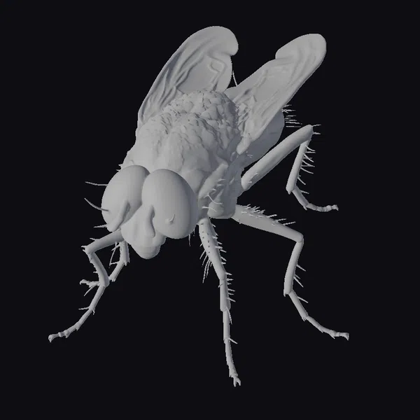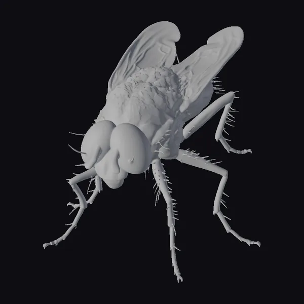 Positioned in a dynamic, slightly angled pose, this giant housefly model showcases its impressive details. The texture of its brown body and wings, complete with tiny hairs and veins, is meticulously rendered. The large, bright red eyes are particularly striking, with a subtle sheen that suggests moisture. The long, spindly legs and antennae are covered in fine hairs, adding to the model’s realism. This level of detail makes the model suitable for use in various applications, such as film and video game environments, scientific illustrations, or even educational materials. Its realistic appearance could also make it a great asset for animation projects or 3D printing.