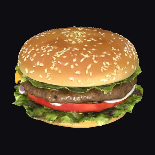 Rendered in exquisite detail, this 3D model of a giant sesame burger presents a culinary masterpiece. The burger boasts a generously proportioned sesame seed bun, glistening with a subtle sheen. A bed of fresh lettuce supports a slice of vibrant red tomato, which in turn cradles a thick, savory beef patty. Melted cheese peeks out from beneath the lettuce, adding a creamy contrast. The entire assembly is set against a clean, neutral background, allowing the viewer’s focus to remain on the burger’s enticing textures and colors. Ideal for use in restaurant menus, food blogs, or advertising campaigns, this model is sure to stimulate appetite and inspire culinary creativity.