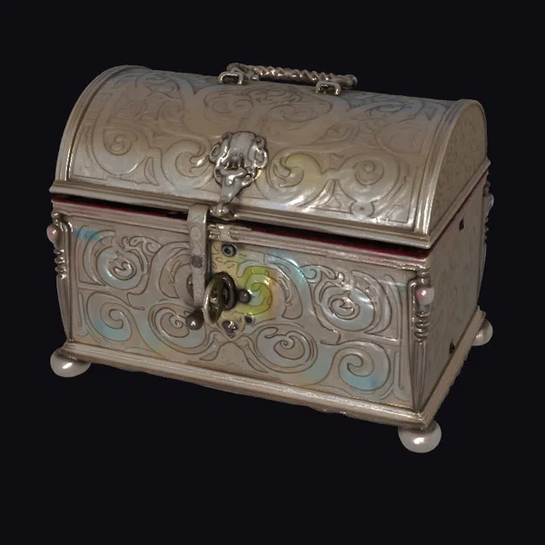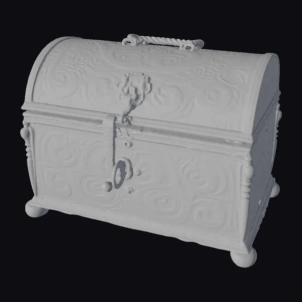 Positioned at a slight angle, the gilded treasure chest showcases its beautifully crafted design. The curved lid features an ornate swirling pattern that mirrors the body of the chest, which is secured with a lock and adorned with a lion’s head clasp. A chain handle sits atop the lid, adding a touch of functionality to its decorative appeal. The chest’s body is supported by small, round feet, giving it a sense of stability and grandeur. The swirling patterns dance across the chest in shades of blue, green, yellow, and gray, catching the light and adding depth to the piece. This 3D model is perfect for use in games, 3D printing, VR/AR experiences, animation, and design projects, where a touch of luxury and mystery is desired.