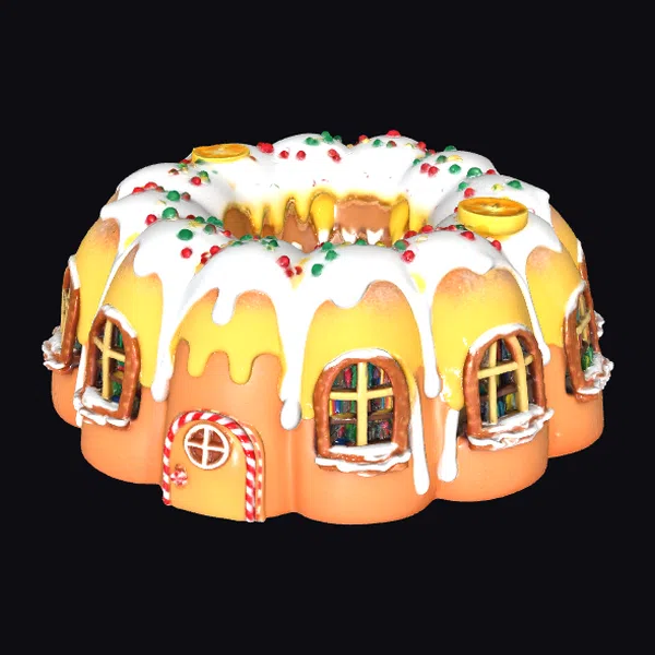 This gingerbread cake house boasts a meticulously detailed exterior, complete with icing that drips down its sides like snow, and a roof scattered with red and green candy decorations. The house features a candy cane door and windows framed with white icing, offering a glimpse into a vibrantly colored interior. Crafted with precision, it showcases a unique blend of culinary art and architectural charm. Ideal for use in holiday-themed projects, such as animations, games, or 3D printing, this model brings a touch of festive magic to any scene.
