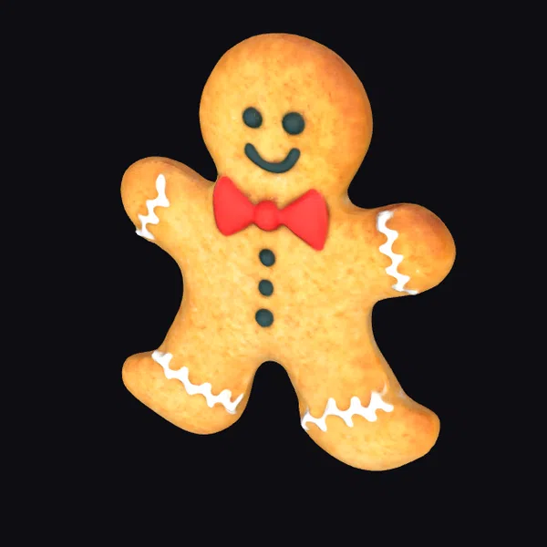 Detailed with precision, this charming gingerbread man boasts a textured surface resembling baked gingerbread, complete with a glossy red bow tie and three black buttons down its chest. White icing accents dance across its limbs, adding a touch of festive flair. Positioned with arms outstretched and a warm smile, this model is perfect for a variety of creative applications, from animation and game design to 3D printing and architectural visualization. Its stylized appearance ensures it will bring a lighthearted and joyful atmosphere to any scene.