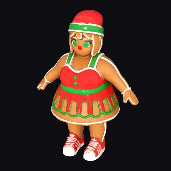 Detailed with precision, this gingerbread woman figurine boasts a sturdy build and endearing facial features. Her blonde hair is styled in a bob, peeking out from under a red Santa hat with a green band. A red dress with green accents and white icing details complements her playful outfit, paired with matching red sneakers. The model’s textures and colors evoke a sense of warmth and festivity, making it ideal for use in holiday-themed games, animations, or as a decorative element in architectural visualizations. Its stylized appearance allows for versatile applications, from advertising to educational materials.
