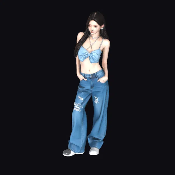 Rendered in exquisite detail, this 3D model captures the essence of contemporary fashion with a young woman dressed in a trendy denim outfit. Her pose, with one leg slightly bent and hands in her pockets, exudes a casual confidence. The model’s long, dark hair flows down her back, framing her face and complementing her stylish attire. The outfit consists of a light blue, bow-tied top that leaves her midriff exposed, paired with wide-legged, distressed jeans that have a fashionable, lived-in look. The model’s facial features are delicately rendered, with a subtle expression that adds to her allure. This model is perfect for projects requiring a modern, youthful character, such as animations, games, or virtual reality experiences.
