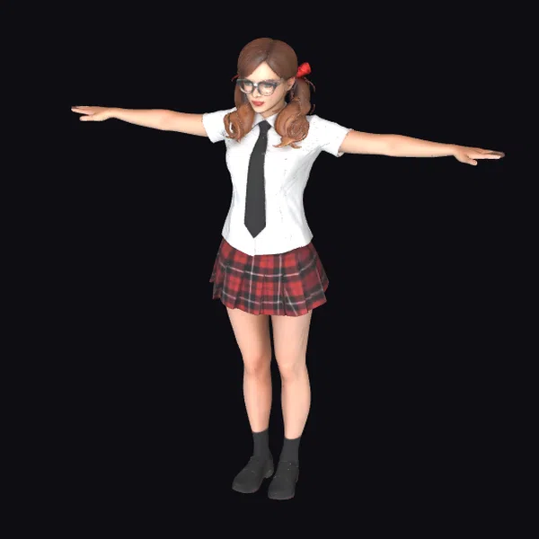 Detailed in every aspect, from the soft curls of her brown hair tied with a red ribbon to the sharpness of her glasses, this stylized model of a girl in a school uniform is meticulously crafted. Her arms outstretched, she wears a white short-sleeved shirt with a neatly tied black tie, a red and black plaid skirt, and black socks with shoes. The model is perfect for projects requiring a youthful, animated character, such as animations, games, or virtual reality experiences. Its stylized yet realistic features make it versatile for various applications, including educational and entertainment purposes.