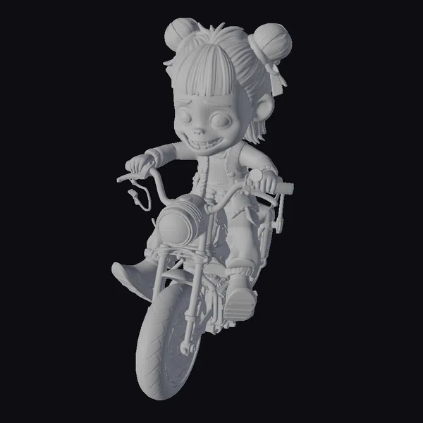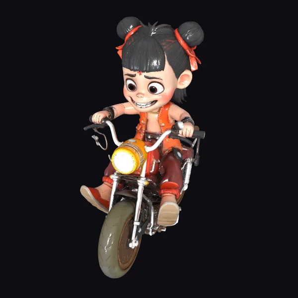 Detailed with precision, this cartoon-style 3D model showcases a girl with distinctive black hair styled in two buns, adorned with red ribbons, and a bright orange and red ensemble that screams fun and energy. The motorcycle, equally detailed, features a shiny chrome body and a vibrant orange headlight, complementing the girl’s adventurous stance. Ideal for projects requiring a lively, animated feel, such as animations, games, or graphic designs. Its stylized appearance offers versatility in various creative contexts.
