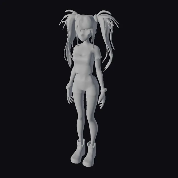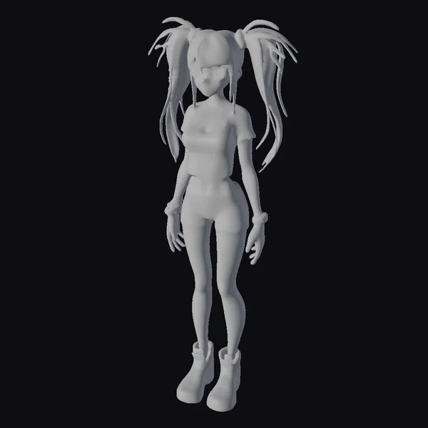 Standing confidently with her hands by her sides, this stylized female character boasts a dynamic pose that captures a youthful energy. Her red hair, divided into two ponytails, is adorned with purple hair ties, adding a pop of color to her overall appearance. The green and white striped shirt, paired with short denim shorts and purple boots, creates a casual yet stylish outfit. The addition of multicolored socks and bracelets on her wrists adds to her playful demeanor. This model is highly detailed, with clear textures and a well-proportioned physique, making her suitable for various applications such as game development, animation projects, 3D printing, and virtual reality experiences.