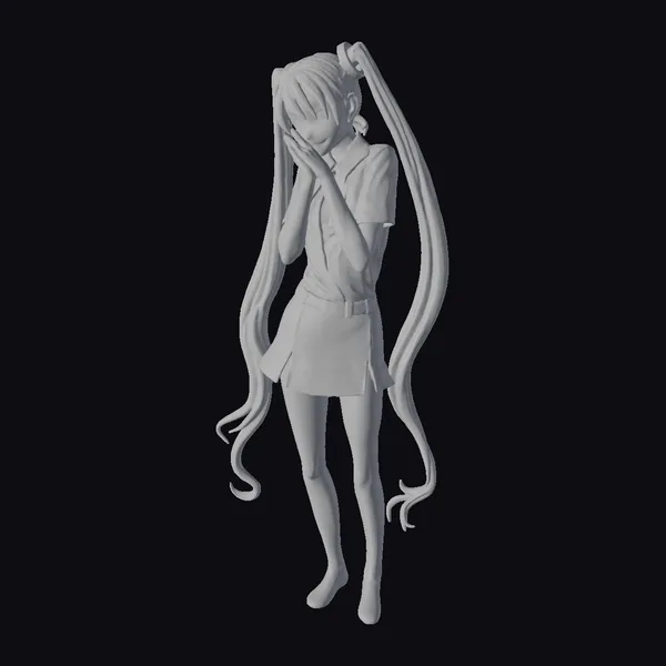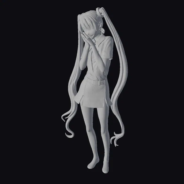 Detailed in a dynamic pose, this character model showcases a young girl with exceptionally long, flowing turquoise hair divided into two ponytails, complemented by a white short-sleeved shirt, a gray pleated skirt, and dark gray stockings. The model’s facial expression and posture convey a sense of innocence and playfulness. The turquoise hair, with its wavy ends, adds a lively touch to the overall appearance. This model is well-suited for projects requiring an anime-style character, including games, animations, and virtual reality experiences.