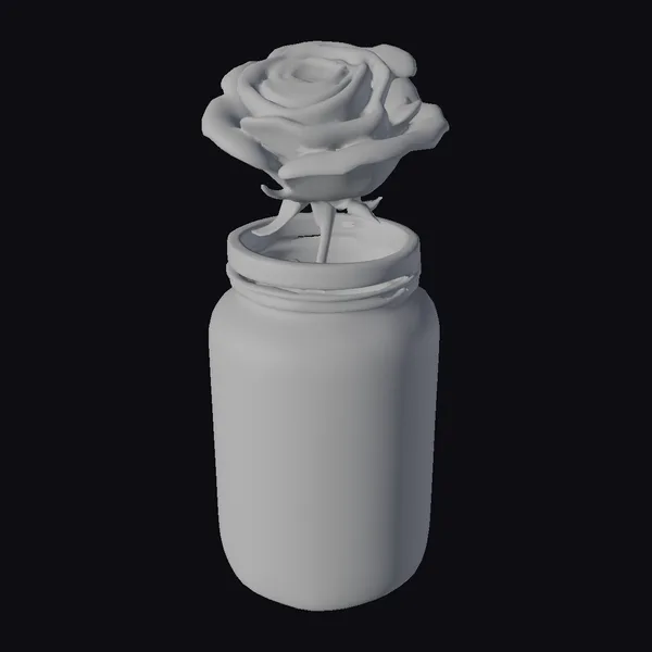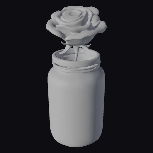 In a stunning display of realism, this 3D model captures a glass jar, its transparency and clarity meticulously detailed, with a single red rose rising from its mouth. The jar is half-filled with clear water, through which the rose’s green stem elegantly descends. The rose itself, a vibrant red, boasts lifelike petals that seem to softly glow with an inner radiance. The entire scene is bathed in a soft, diffused light that accentuates the textures of the glass and the delicate folds of the rose’s petals. Ideal for use in 3D rendering projects, animations, or virtual reality experiences where realism and detail are paramount.