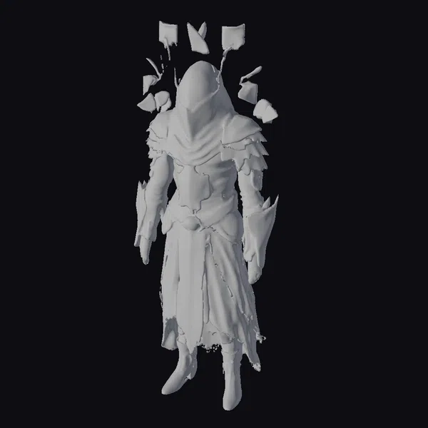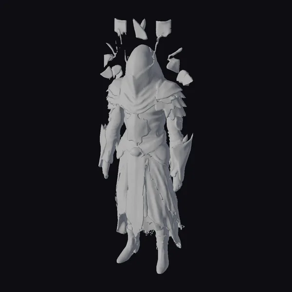 This hauntingly beautiful 3D model depicts a humanoid warrior enveloped in a suit of armor composed of shattered glass shards. The dark, tattered clothing underneath the armor suggests a figure shrouded in mystery and darkness. The mirrored helmet or mask not only conceals the warrior’s face but also appears to be cracking and breaking apart, adding to the overall sense of decay and menace. The pose, with the shards floating around the head, suggests a dynamic and powerful presence. This model is perfect for projects requiring a dark fantasy element, such as games, animations, or virtual reality experiences. Its unique design and the play of light on the glass shards will add a captivating element to any scene.
