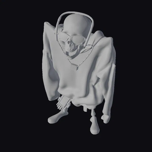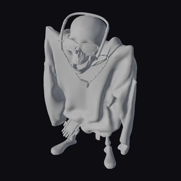 This stylized model showcases a green, glittery skull donning a pair of sleek sunglasses and a vibrant, multicolored sweater. The character’s ensemble is completed with a chunky necklace featuring a blue pendant and white headphones draped over its head. A futuristic gun holster is attached to its waist, adding an edgy touch. The model’s pose and accessories create a dynamic, humorous atmosphere. Its versatility makes it suitable for various applications, including games, animations, and 3D printing. The detailed textures and colors bring this character to life, making it a great addition to any creative project.